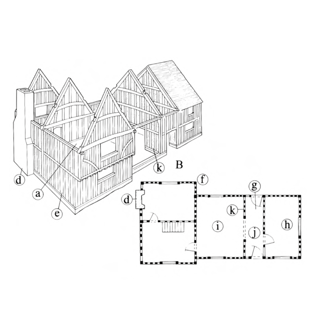 a*) Solar d*) Lateral chimney e) Wing f) Upper end g) Cross passage h) Lower end i) Hall j) Half bay k*) Spere