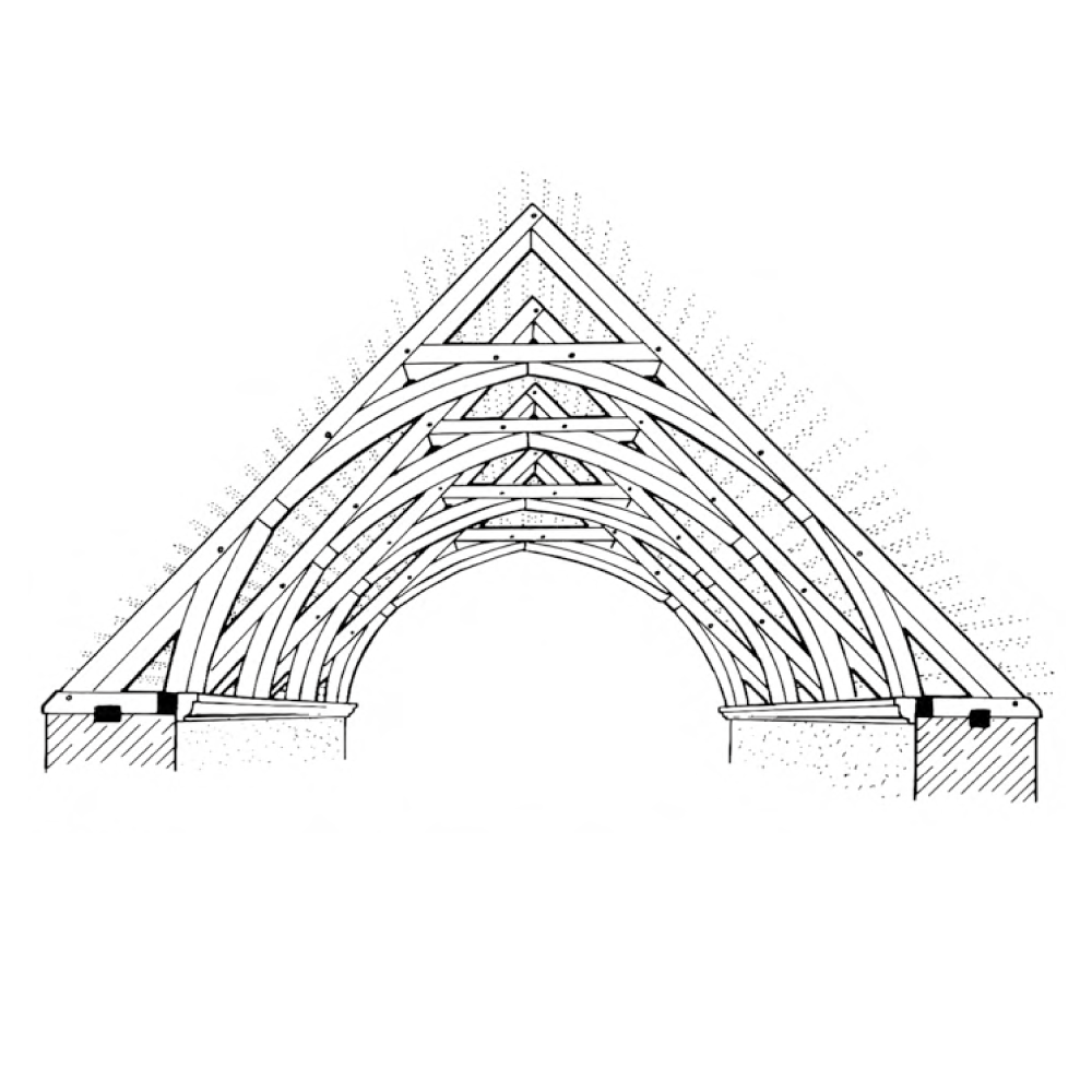 (Double arch-braced common-rafter roof) with moulded cornice