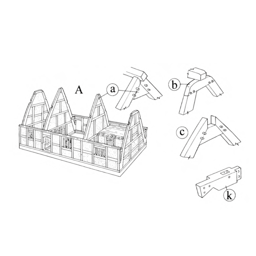 f) Cruck stud g) Wall plate h) Packing piece i) Ridge piece j) Collar k*) Spur l) Cruck blade m) Sill beam