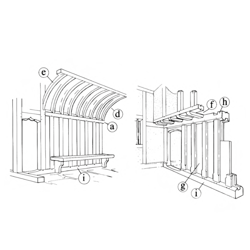 a) Dais beam d) Canopy e) Coving f) Internal jetty g) Stud and panel partition h) Head beam i) Sill beam k) Cresting