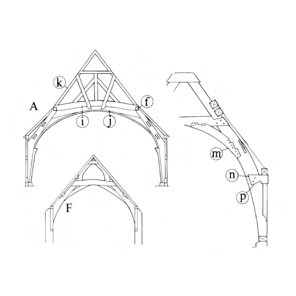 f*) Plate i) Upper tiebeam j) Lower tiebeam k) Common rafter m) Joggled halving n) Barefaced dovetail p) Spur
