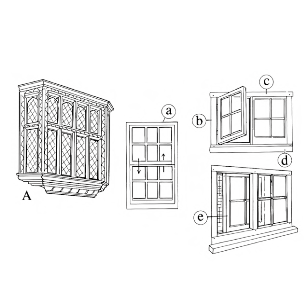 a) Hung sash b) Casement window c*) Lintel d*) Sill e) Sliding sash