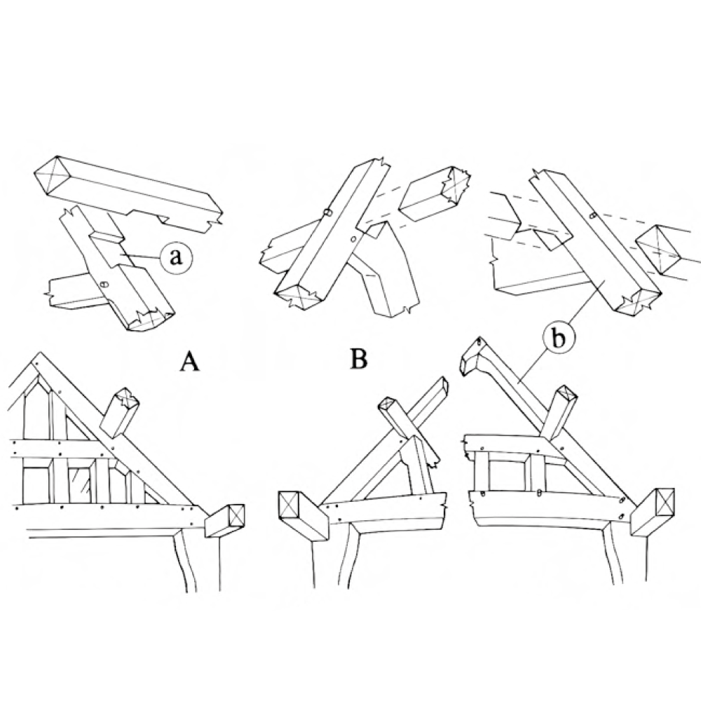 a) Wall plate b) Cusp c) Cusped windbrace d) Ridge piece (ridge purlin) e) Principal rafter f*) Plate g) Purlin h) Cranked tiebeam l) Ceiling beam