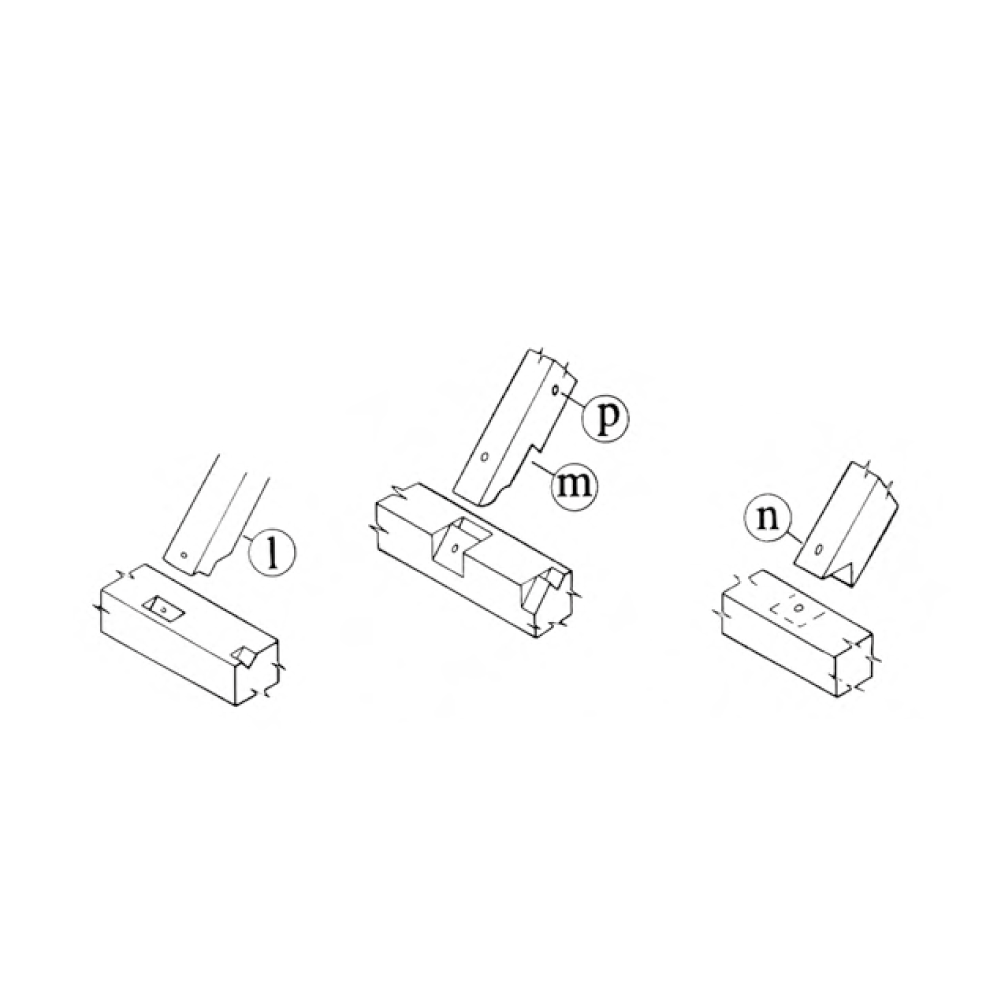 l) Scotched rafter foot m) Scotched rafter foot (with extended rafter) n) Birdsmouthed rafter foot p) Rafter hole