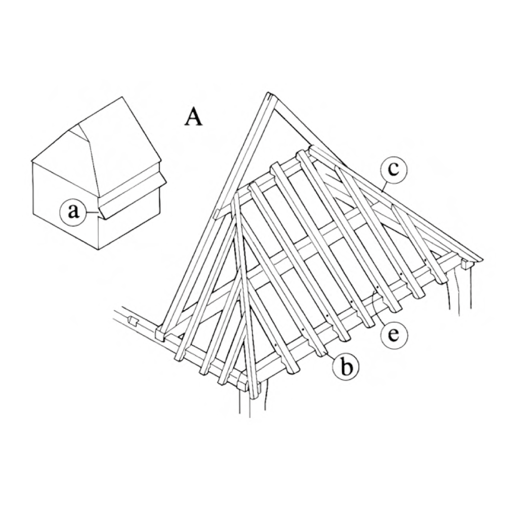 a*) Lath b) Dragon beam c) Dragon tie d) Hip rafter e) Jack rafter f) Hip g) Pentice h) Gable i) Catslide roof over outshut j) Verge rafter k) Valley rafter
