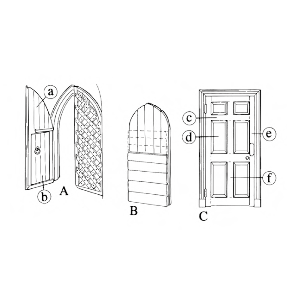 a) Door leaf b) Wicket c) Rail d) Panel e) Stile f) Muntin