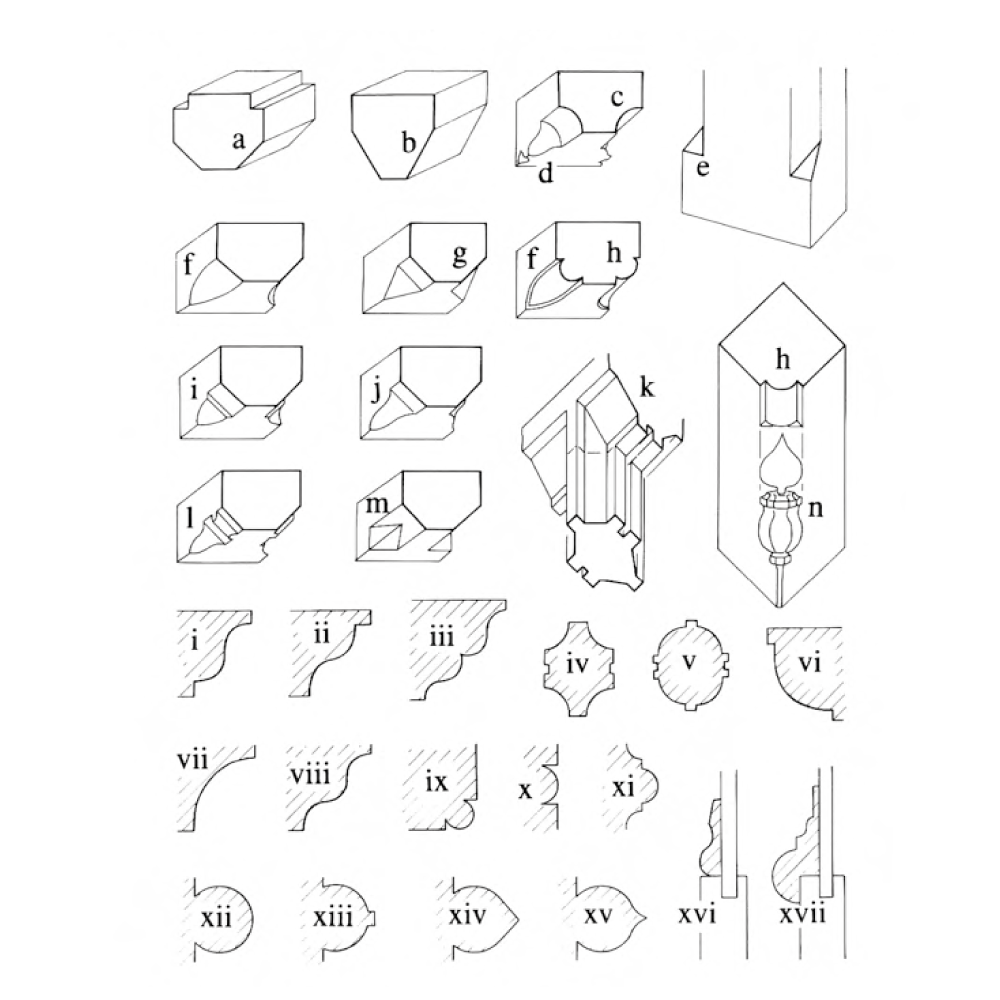 i) Scroll or ogee (cyma recta) ii) Scroll or ogee (cyma reversa) iii) Double ogee iv) Hollow (Cavetto; on mullion) v) Ovolo vi) Quarter round vii) Hollow viii) Wave ix) Angle bead (Bowtell) x) Flush bead xi) Half round (Torus) xii) Plain roll xiii) Roll and fillet xiv) Pointed roll xv) Keeled roll xvi) and xvii) Bead mouldings on panels