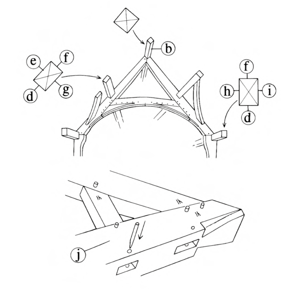 b*) Ridge purlin d*) Soffit (face) e) Upper side f*) Top (face) g) Lower side h) Inner side i) Outer side j) Upper face of truss