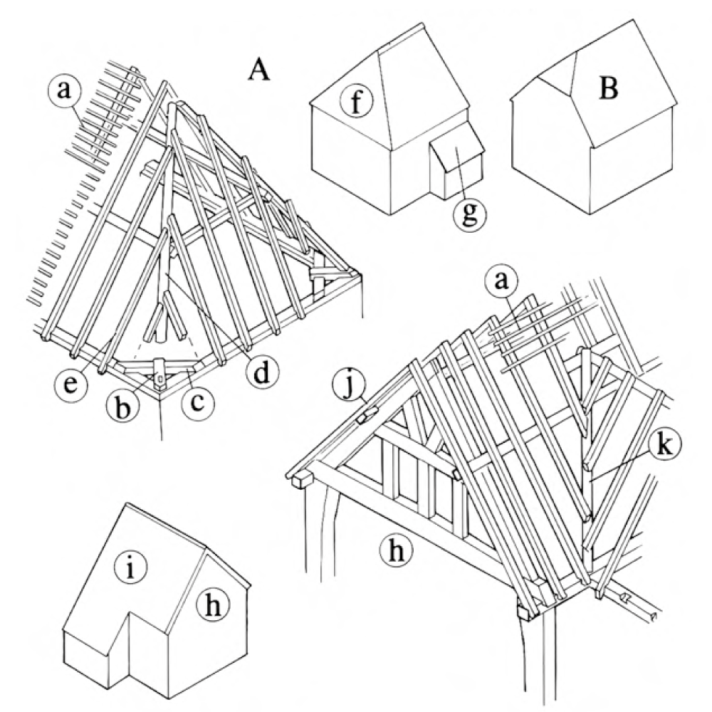 a*) Lath b) Dragon beam c) Dragon tie d) Hip rafter e) Jack rafter f) Hip g) Pentice h) Gable i) Catslide roof over outshut j) Verge rafter k) Valley rafter