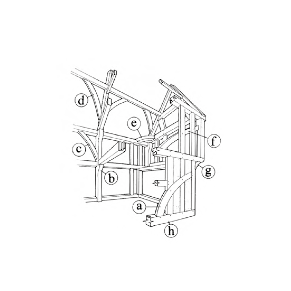 a) Wall plate b) Cusp c) Cusped windbrace d) Ridge piece (ridge purlin) e) Principal rafter f*) Plate g) Purlin h) Cranked tiebeam l) Ceiling beam